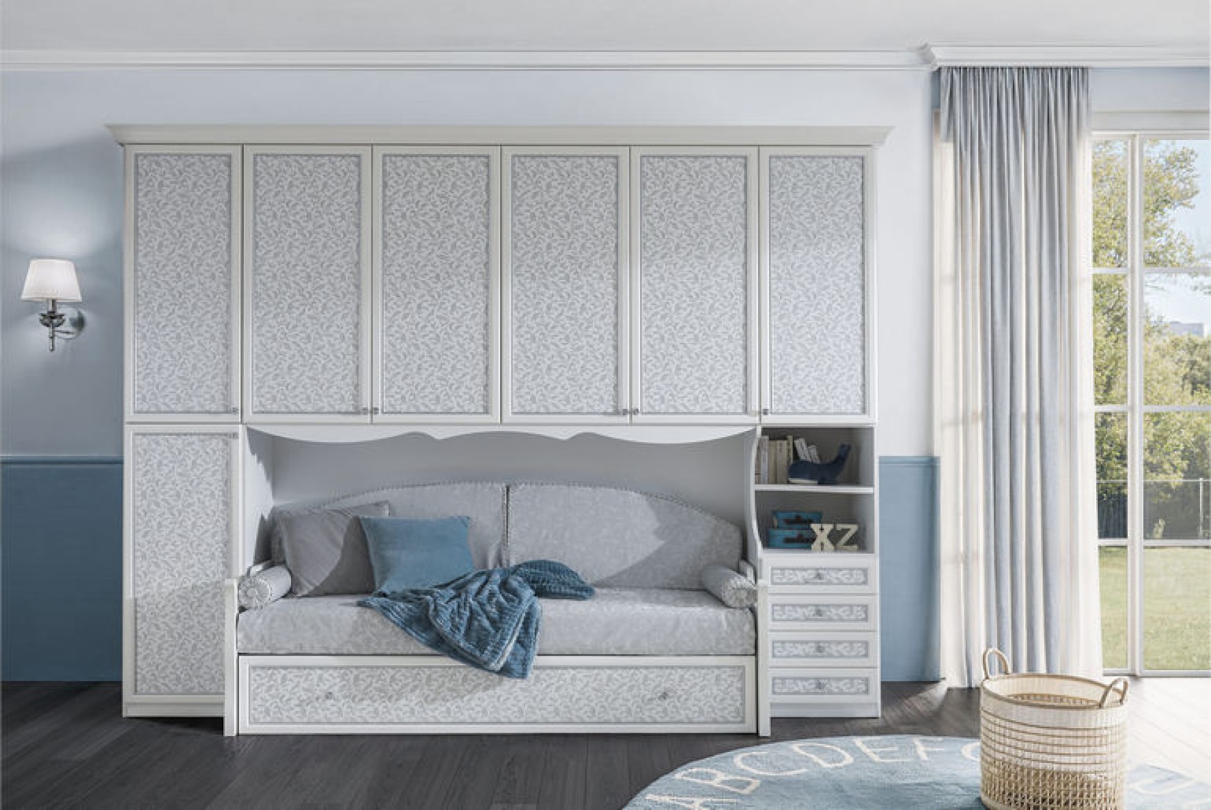 Struttura: colore bianco frassino. Frontali: bianco frassino con profilo treccia argento e anta glitterata, maniglie e pomelli argento. Divano estraibile con doppia rete o con cassettone.
