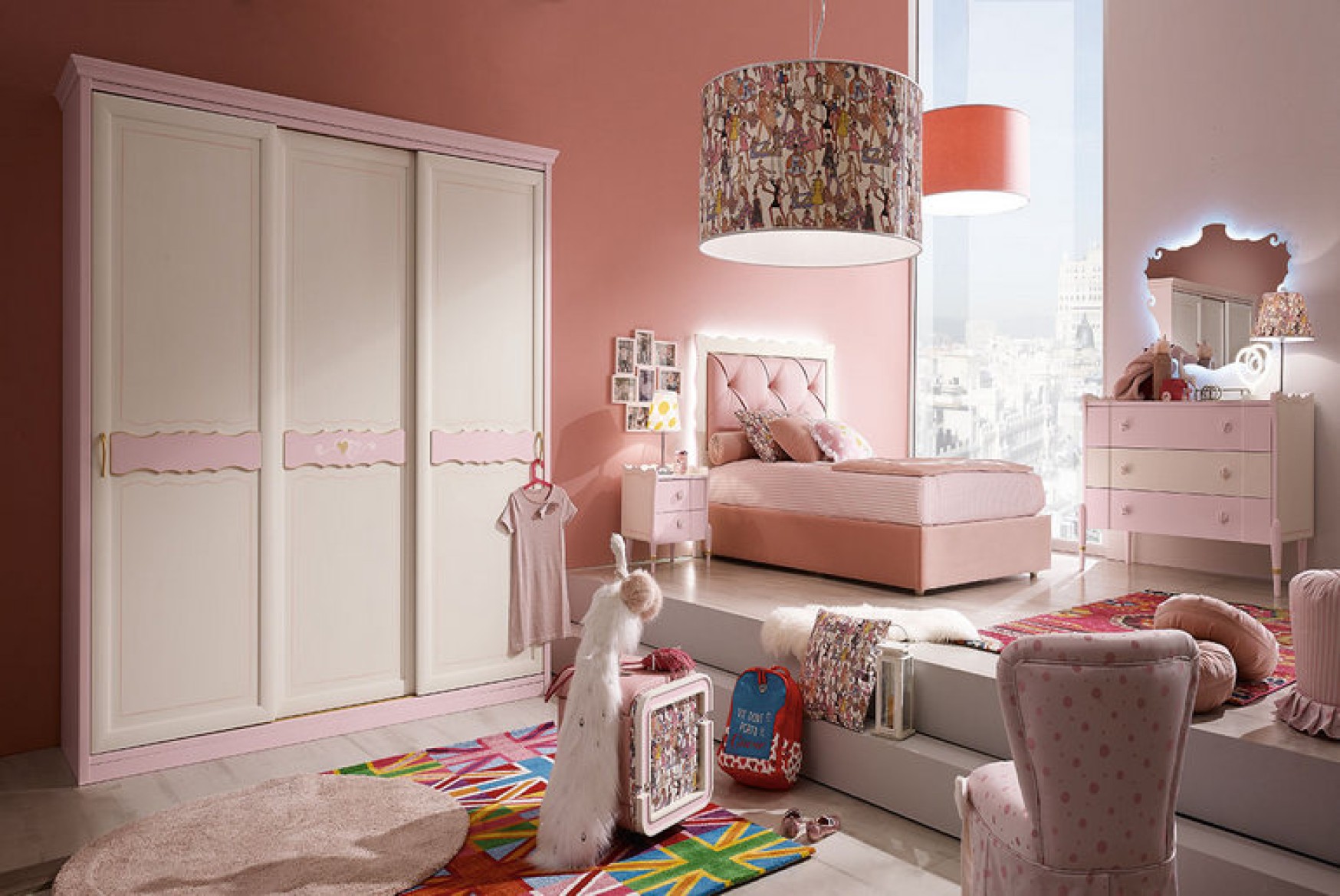 Struttura armadio: rosa, frontali avorio e traversi colore rosa; Struttura comodino avorio, cassetti colore rosa; Struttura como' avorio, cassetti colore rosa e avorio.